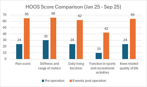 The Hip Disability and Osteoarthritis Outcome Score (HOOS) assesses hip pain, mobility, and daily functional ability from the patient’s perspective, both before and after surgery. These scores allow us to evaluate treatment effectiveness and monitor improvements in hip function and overall well-being.